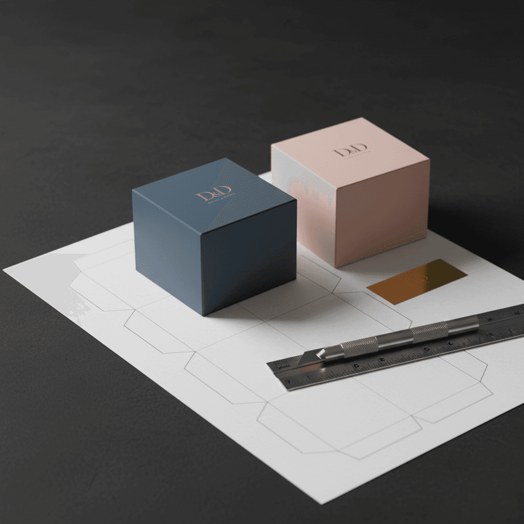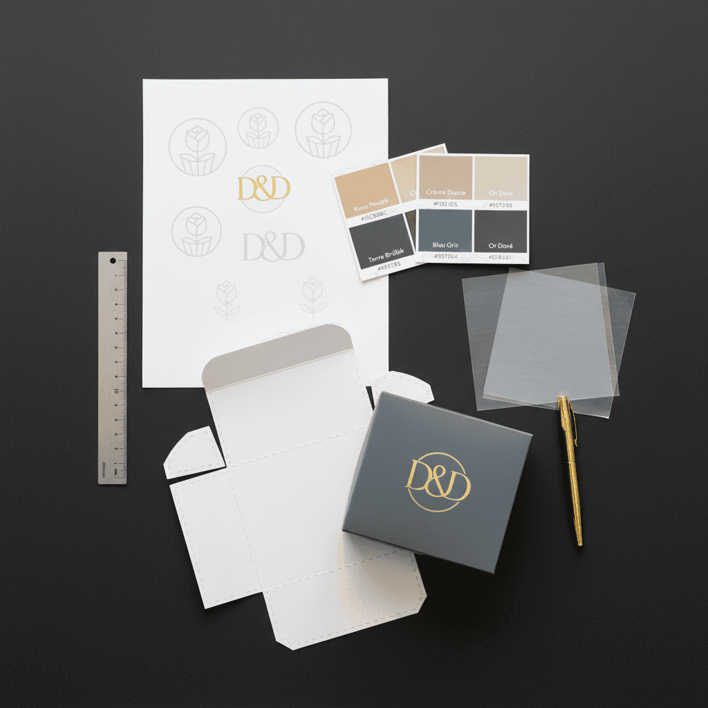The final designs center on the D&D monogram encircled in a simple frame, paired with an elegant wordmark that feels timeless and confident. A palette of Rose Poudré, Crème Douce, Bleu Gris, Terre Brûlée, and Or Doré gives the brand a soft, earthy warmth while still feeling upscale. Typography is restrained and legible, balancing refined serif details with clean sans-serif support to create clear hierarchy across applications. This visual language is brought to life through premium pastry boxes in varying sizes and colors, each treated with subtle foil accents and structured layouts that echo luxury packaging categories like jewelry and fragrance. Supporting print pieces and mockups reinforce the same tone, so every touchpoint from logo to packaging contributes to a cohesive, indulgent brand experience for Doux & Doré.